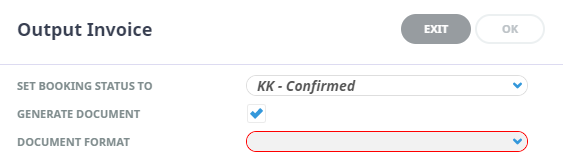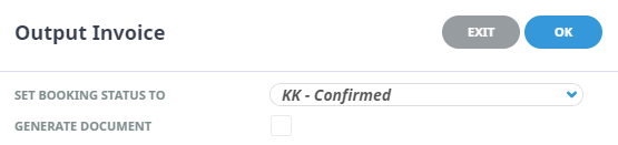 Output Invoice screen, select an appropriate booking status from the drop-down field Set Booking Status To, choose whether or not to generate a document (including specifying the document format) and click OK.
