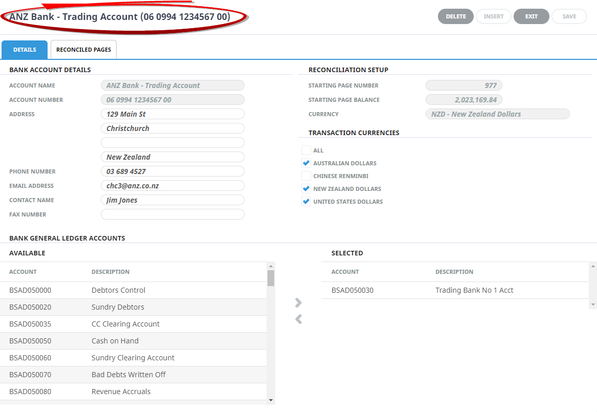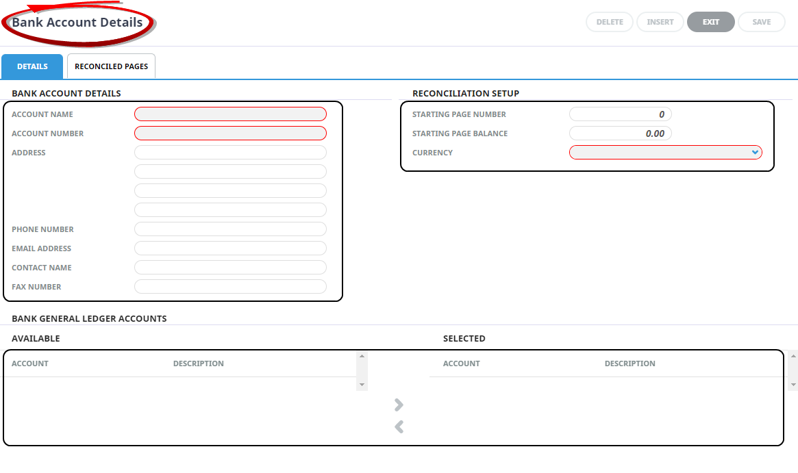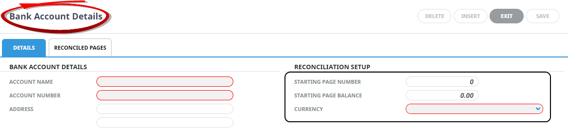 When a new or additional physical bank account is created, information is displayed across two tabs; the Details tab and the Reconciled Pages tab. This screenshot