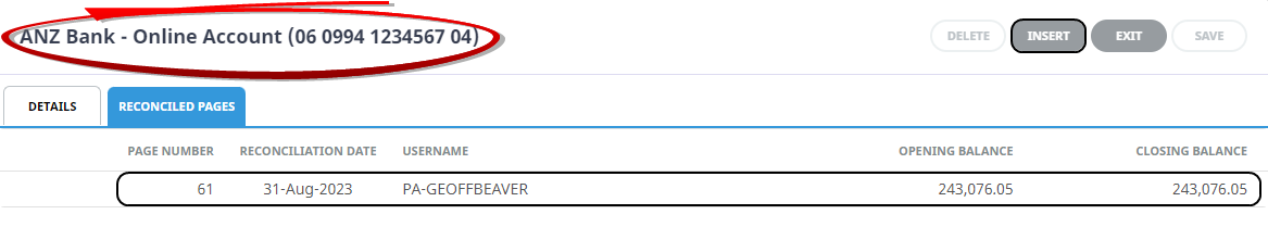 Example Bank Reconciliation - Initialisation Page