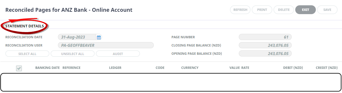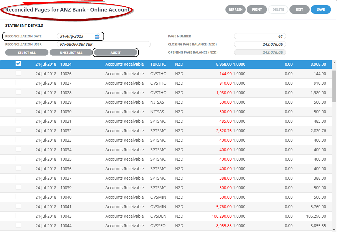 3. NOTE: When a transaction line has been tagged, Audit becomes active. Clicking the Audit will open the currently highlighted transaction to provide full details of it.