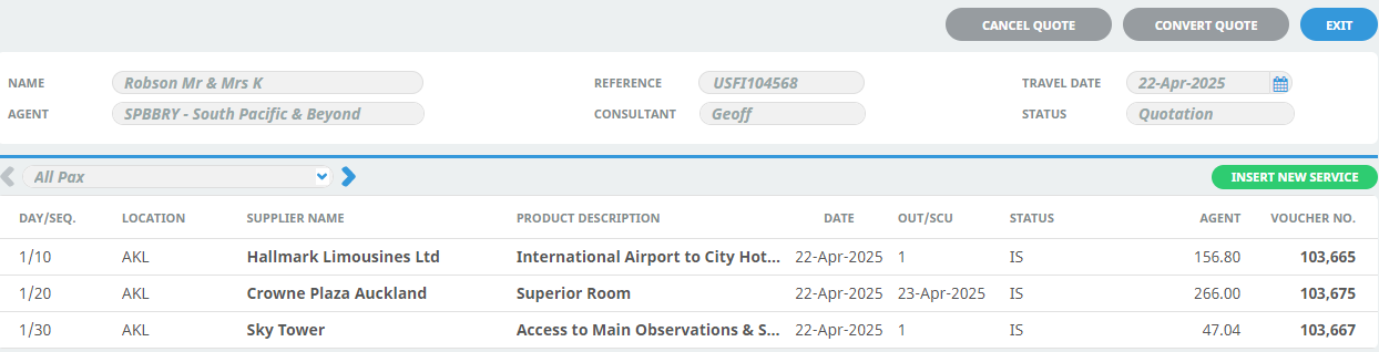 The following screenshot shows the Itinerary view of the new FIT Booking created in this chapter. Additional services can be added simply be clicking Insert New Service. Refer to About the Itinerary View Columns for a description of each column in this view.