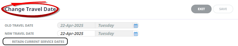Leaving the 'Retain Current Service Dates' unchecked indicates to the system that the dates of all services in the booking will be changed to reflect the new Travel Date; i.e., the services at Day 1 will inherit the new travel date; the services at day 2 will become new travel date + 1 day and so on.