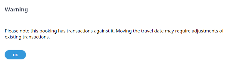 If the booking has transactions recorded, a warning message will display alerting consultants of possible transaction adjustment requirements.