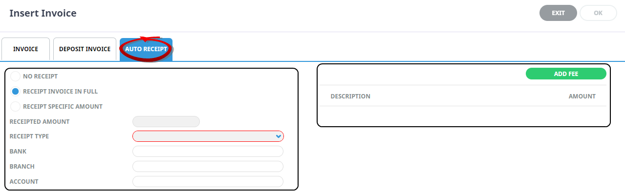 Insert Invoice Screen (Tab 3 - Auto Receipt)