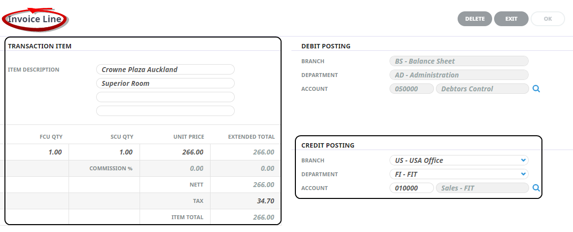 NOTE: The Credit Posting section will have the General Ledger account in it that the credit side of the transaction will be posted to. This will be the default Revenue Account as set up in the General Ledger INI settings. This account detail should not be altered - if the incorrect account is chosen, cross ledger postings could result which will cause difficulty in reconciling.