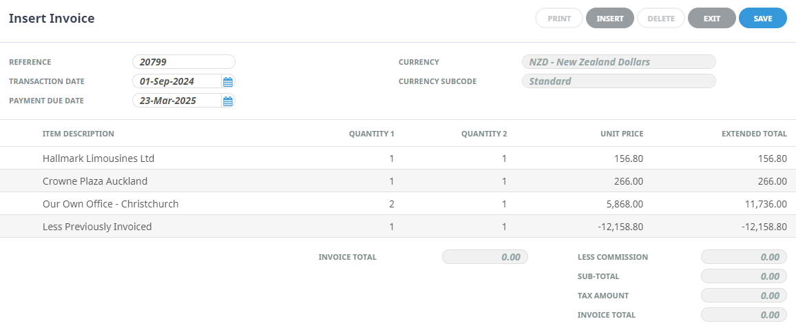 - The total outstanding value of the booking. If previous invoices have been raised, the new invoice will be for the total booking value with an additional "Less Previously Invoiced" line subtracting the value already invoiced.