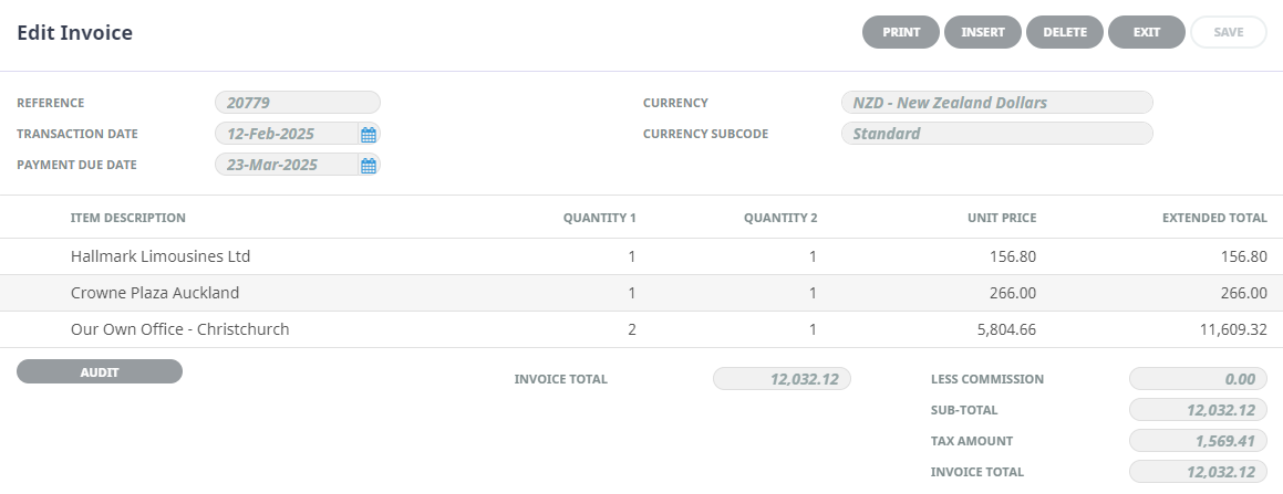 NOTE: To change anything on the Edit Invoice screen, click one of the Item Description lines to display the Invoice Line screen, and make your changes there.