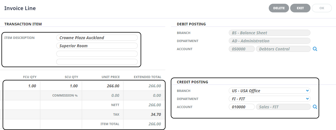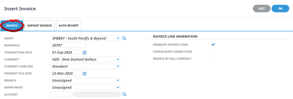 This is the Transaction Date and determines the Transaction Period. The default date here will depend on an accounting INI setting. The default transaction date could be either today’s date, the booking travel date, the date of the last service in the booking or a date based on the current accounting period. The default date can be overridden if a different date is required on the invoice. The transaction date cannot be in a closed accounting period.