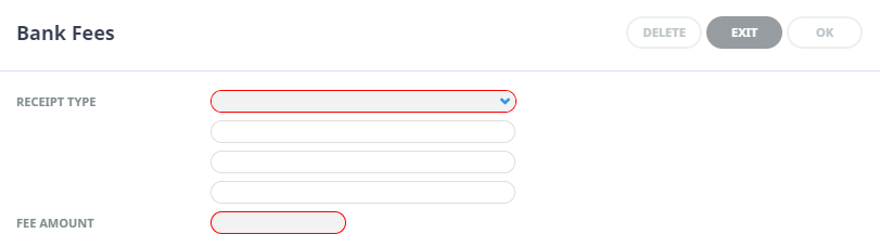 If there is a bank charge associated with the receipt - e.g., foreign exchange transaction fee - clicking this button will allow selection of an additional Receipt Type to allow the fee to be posted to the correct expense account.