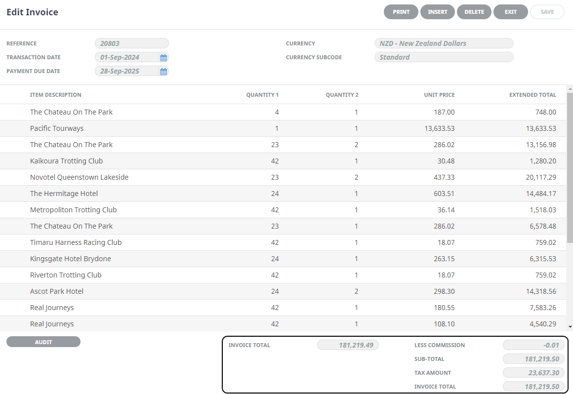 NOTE: To change anything on the Edit Invoice screen, click one of the Item Description lines to display the Invoice Line screen, and make your changes there.