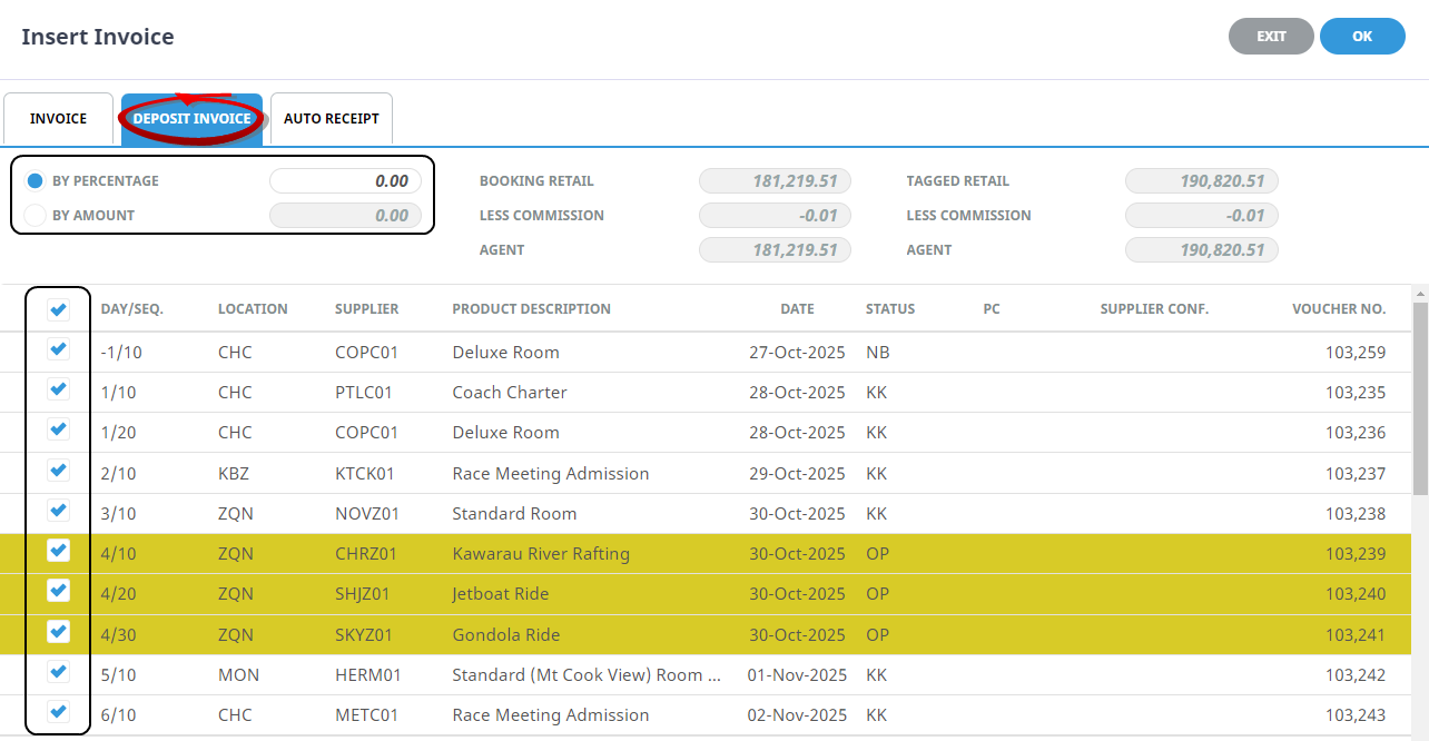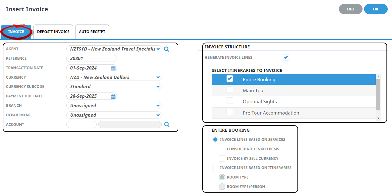 NOTE: It is possible to issue multiple invoices for a booking to different agents/clients by changing the agent code in this field.