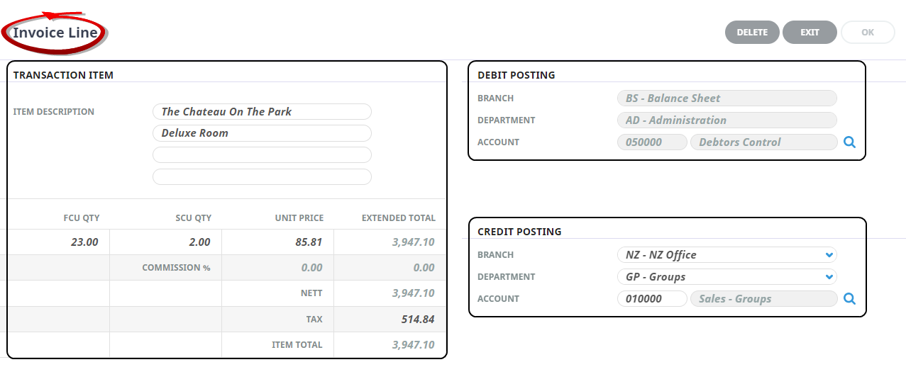 This is the Transaction Date and determines the Transaction Period. The default date here will depend on an accounting INI setting. The default transaction date could be either today’s date, the booking travel date, the date of the last service in the booking or a date based on the current accounting period. The default date can be overridden if a different date is required on the invoice. The transaction date cannot be in a closed accounting period.
