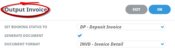 Output Invoice screen, select an appropriate booking status from the drop-down field Set Booking Status To, choose whether or not to generate a document (including specifying the document format) and click OK.
