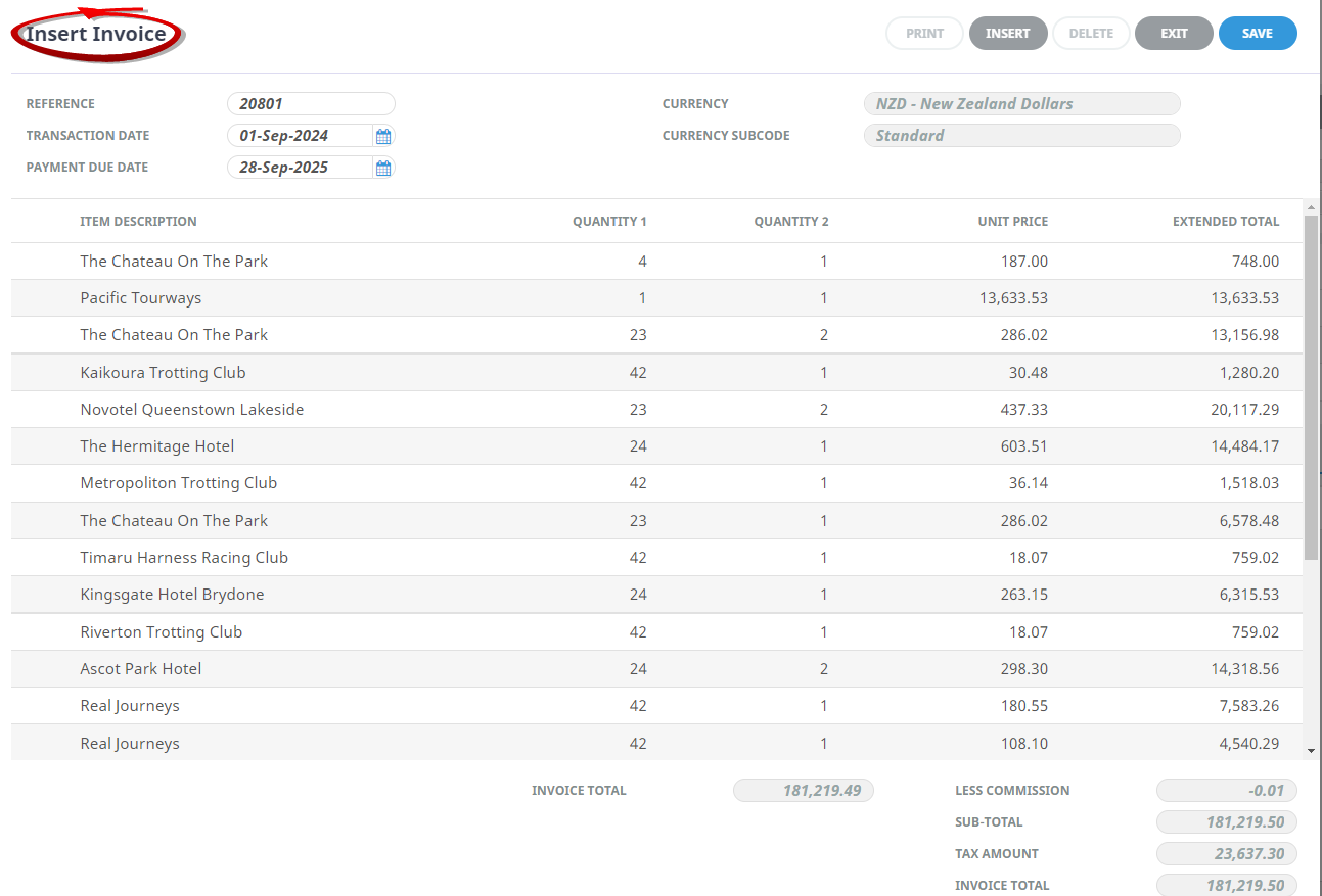 On the Insert Invoice screen, complete the transaction header details, then click the