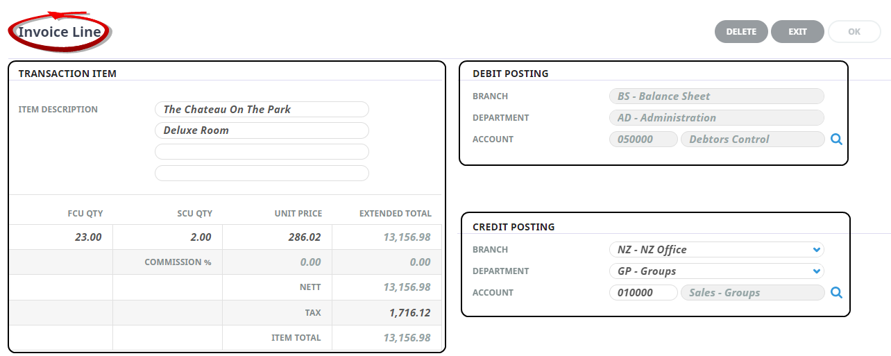 NOTE: The Credit Posting section will have the General Ledger account in it that the credit side of the transaction will be posted to. This will be the default Revenue Account as set up in the General Ledger INI settings. This account detail should not be altered - if the incorrect account is chosen, cross ledger postings could result which will cause difficulty in reconciling.