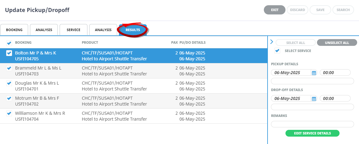 Bulk updates to pick up and drop off times for services can be achieved when using the Booking Operations function Update Pickup and Drop off. Some organisations may need the facility to locate or update a number of services at once.