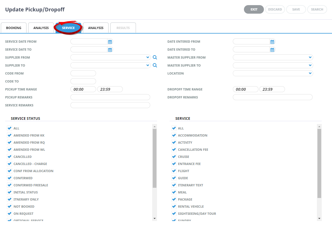 This is the date of the service within a booking. If selection for a range of dates is entered here Pick Up and Drop off details for services that fall within the date range provided will be display in the results screen.
