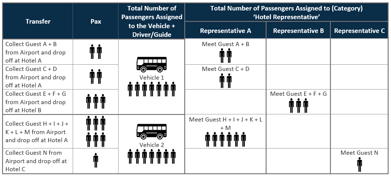 In this example all services within the assignment are treated as a single task. There are two traditional Vehicle + Driver/Guide assignments; two transfer services pick up guest from 5 different bookings and deliver them to their respective hotels. The passengers are assigned to vehicles with a capacity of 7 seats and a passenger manifest would be available for the driver/guide to operate these transfer services. There is also a hotel representative for each hotel who needs to meet with their respective passengers on arrival. Representative A has 10 passengers to meet and requires their own manifest from multiple transfer arrivals. Given that there is a requirement for two resource assignments to be allocated simultaneously, an additional category is created in system setup to cater for this occurrence.