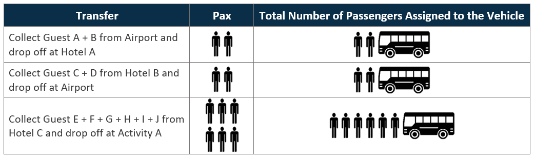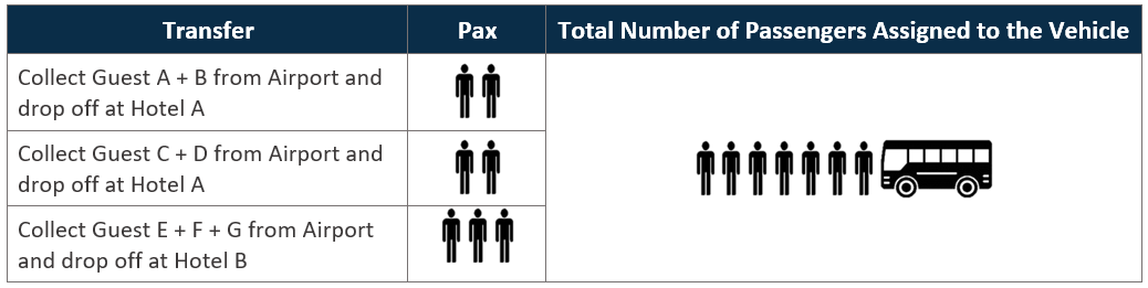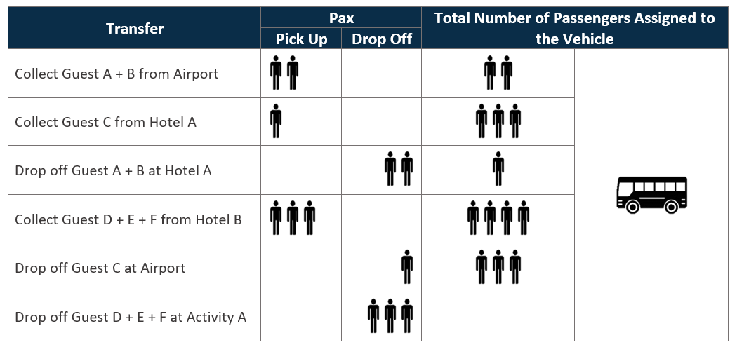 In this example the total passenger count does not exceed 7 as this 'vehicle' assignment has a maximum seat capacity of 7. The assignment collects and drops guests to and from different locations where guests 'hop on and hop off' the same service. Pick up and drop off locations and times are used to effectively manage the resource.