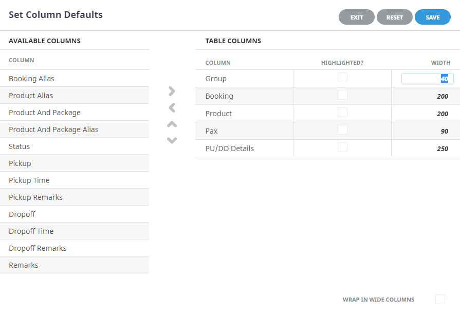 Users can click outside of the column headings within the header line to set column defaults. When the Set Column Defaults form appears, columns can be moved from the Available Columns list to the Table Columns list. Columns with the Highlighted checkbox selected will display the column information in bold, and column widths can be customised depending on user requirements.