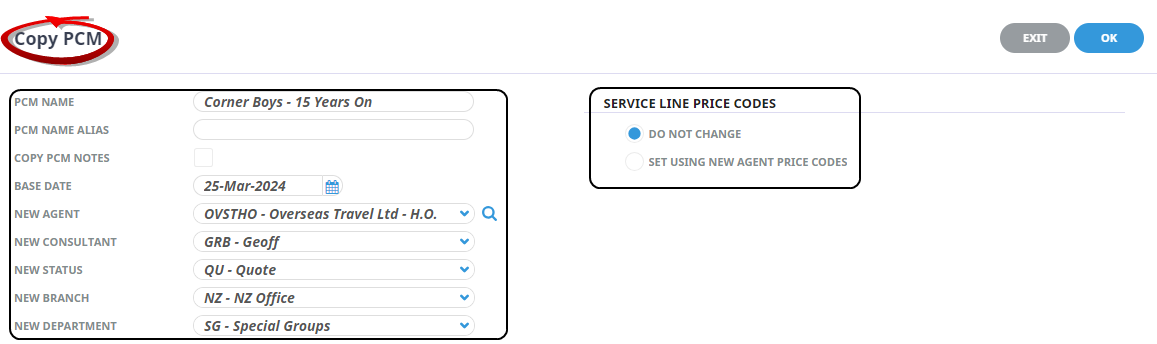 A PCM may be copied to a new name/travel date. First find and recall the PCM to be copied, then replace the existing PCM fields with new values. As the PCM details are copied, the new PCM will be re-costed based on the new Travel Date and Agent chosen.