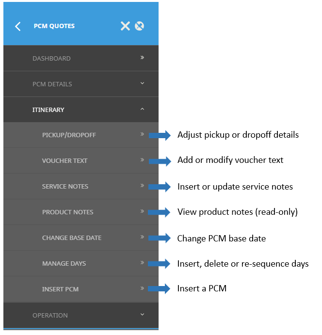 Once created, PCMs need to be viewed, edited, added-to, reported-on and otherwise maintained. Tourplan NX arranges these maintenance operations into three categories; PCM Details, Itinerary, and Operation (there is another category at the top of the menu structure, called the Dashboard, but this is solely for viewing purposes - all fields in the Dashboard view are read-only). Each category has a number of sub-categories that group related screens and fields together, enabling relevant management tasks to be carried out on the PCM.