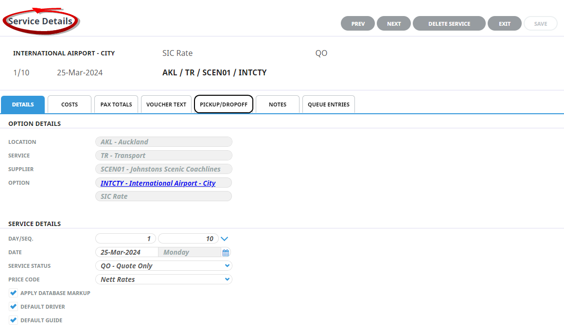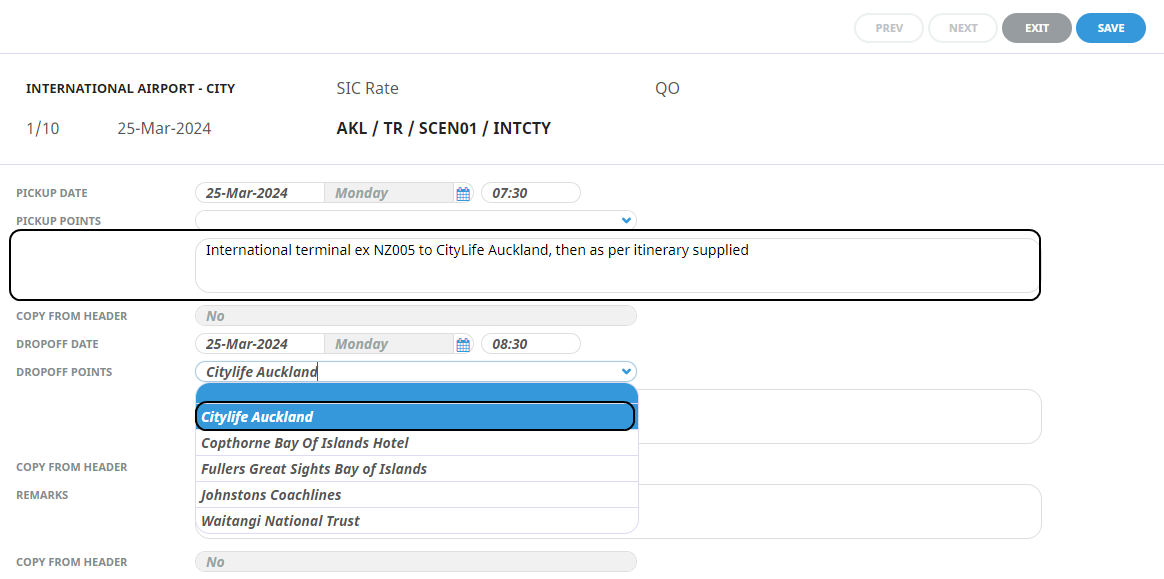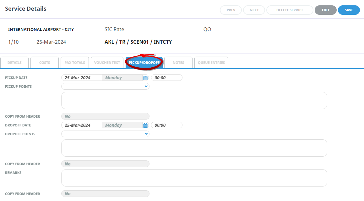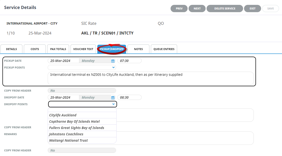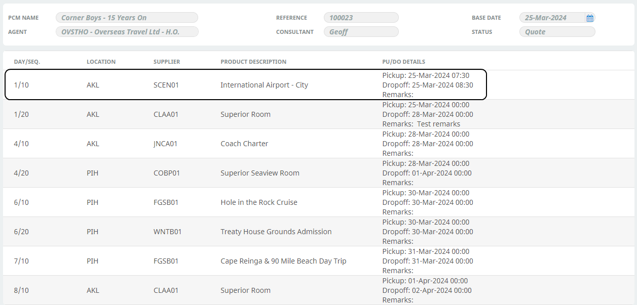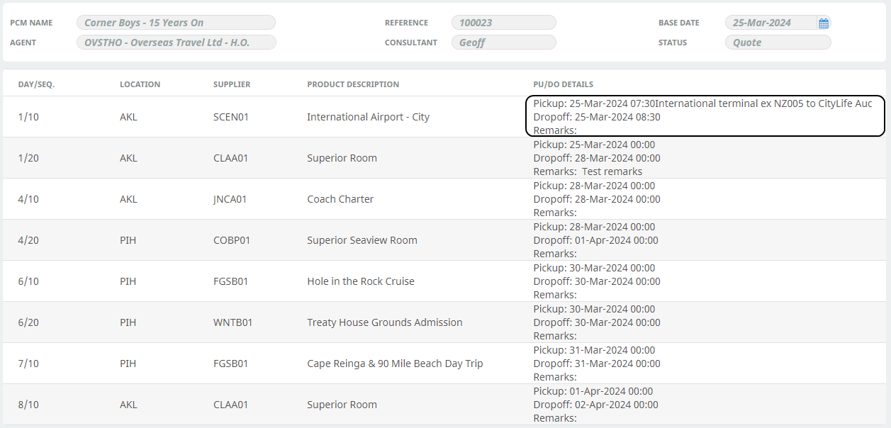 PCM Quotes > Itinerary > Pickup/Dropoff. - From the