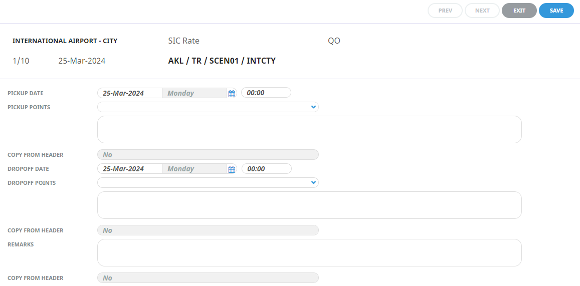 - Click Save to keep the changes, followed by Exit to return to the list of PU/DO Details, or use the Previous and Next buttons to update other services in the itinerary list.