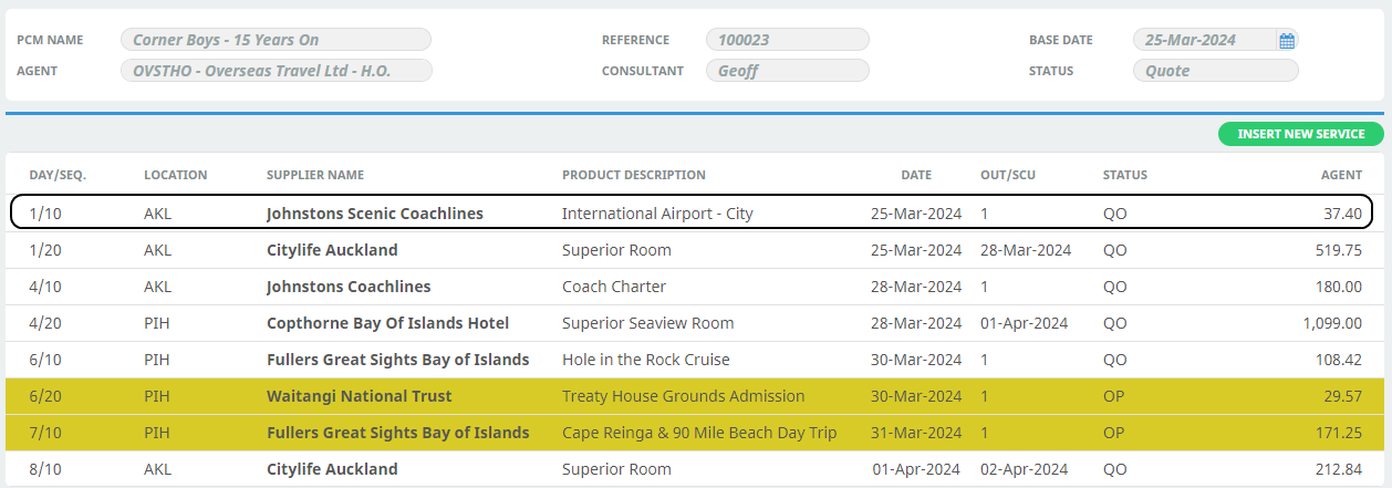 A single service can be opened from the Dashboard by clicking on the service. Alternatively, switch to Itinerary view by selecting, from the PCM Quotes menu,