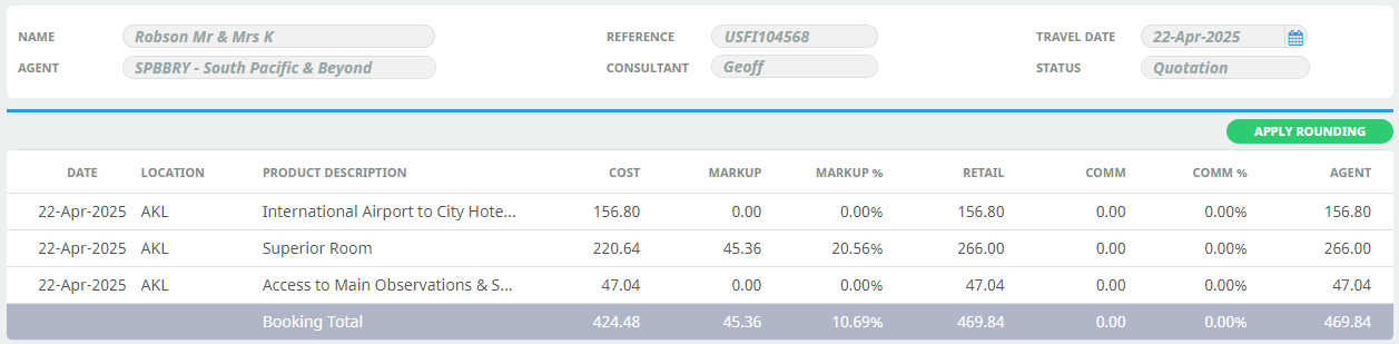 Markup/Commission can be used to change the selling price of a Booking (by adjusting the markup or commission), or to round the prices in a Booking.