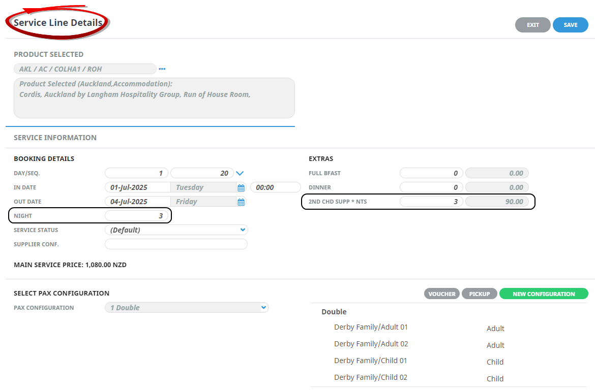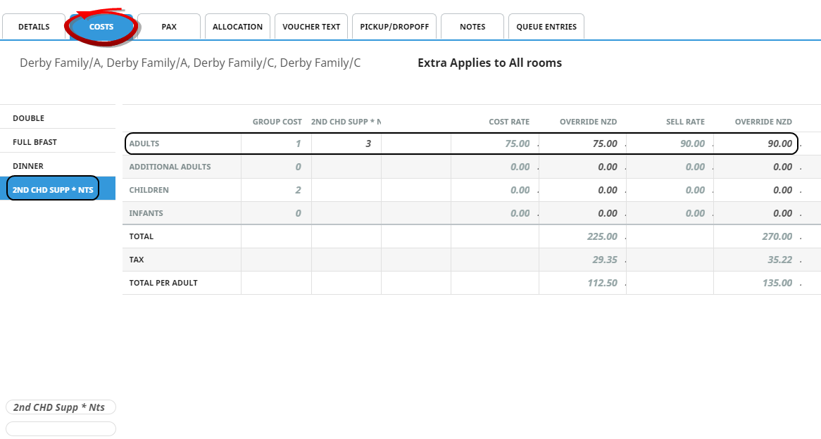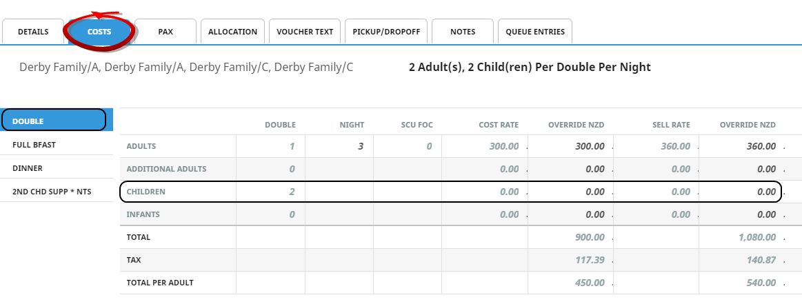 2. Once the service is saved, check the Service Details Costs tab where you will see that the Double room has 2 children with a rate of zero: