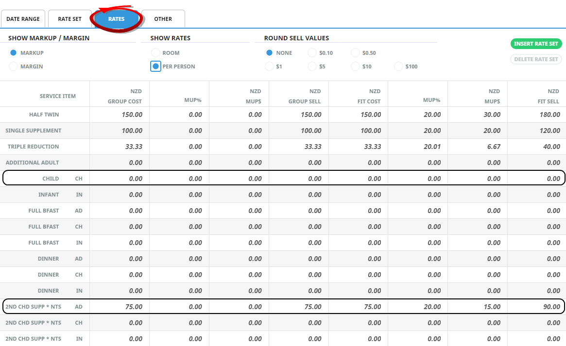 4. In the Rates tab leave the child rate zero and enter 50% of the adult price against the chosen extra.