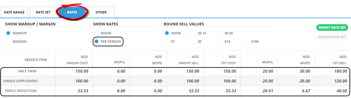 This example shows a Run of House Room per person sell price of 180.00 with a markup of 20%