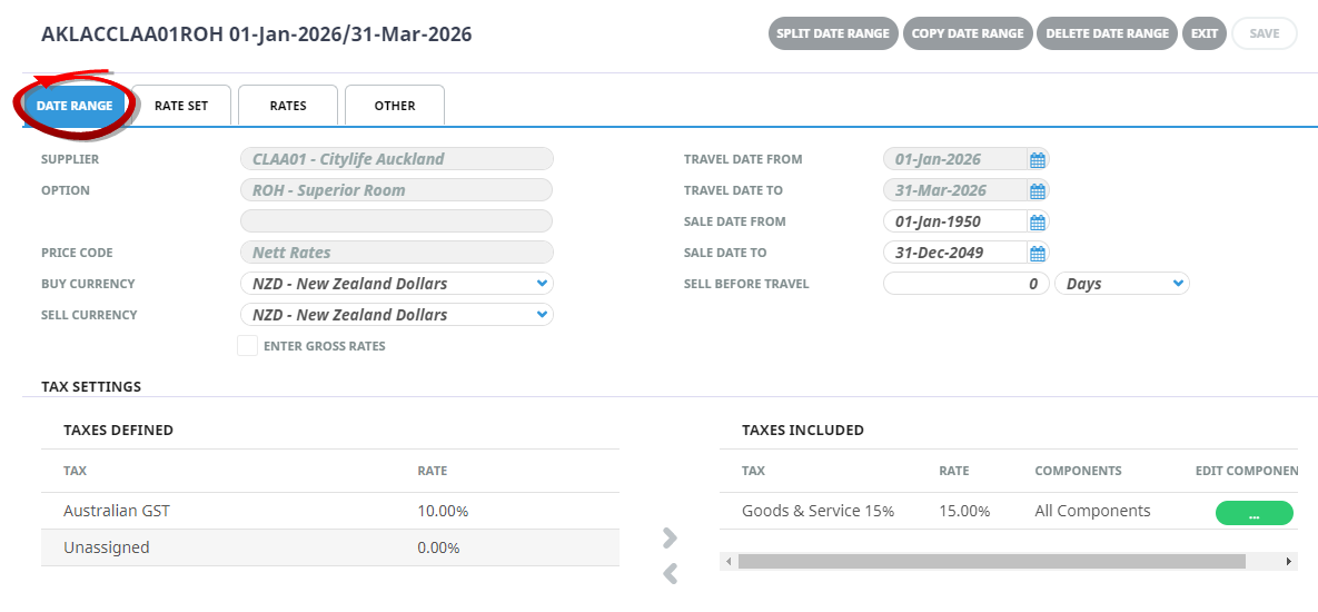 - Taxes already attached to the rate, are listed in the 'Taxes Included' column.