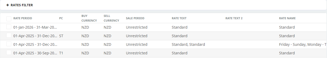 Once several rate entries exist (covering several date ranges), you can use the Rates Filter to find a range. Click the + or - next to the words Rates Filter to expand or collapse the filter fields.