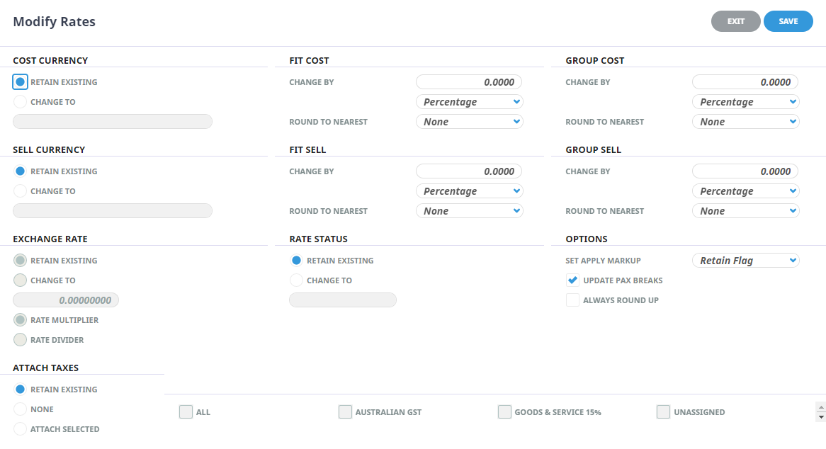 Modify Rates, has a second selection screen which controls how existing rate is to be modified and settings include currencies, cost/sell changes and rounding, exchange rates and taxes, and how the mark up is to be set. The description of all fields in this screen are given below. The selections made here will be applied to each rate displaying in the Results screen.