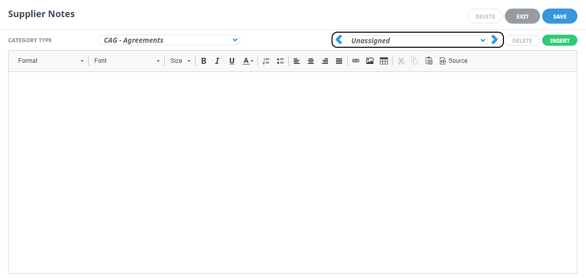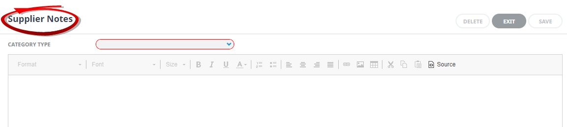 Supplier Notes screen, select a Category Type and enter text in the body of the note (the body is a rich text field - as well as formatting, graphics and tables can also be inserted).