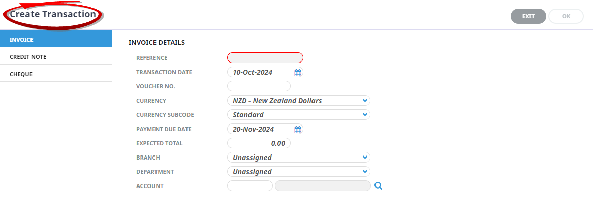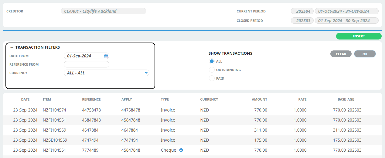 To insert a Creditors Invoice, first select the Creditor that the invoice has been received from. Then select Accounting > Transactions. Finally, click Insert to open the Create Transaction screen (see procedure below).