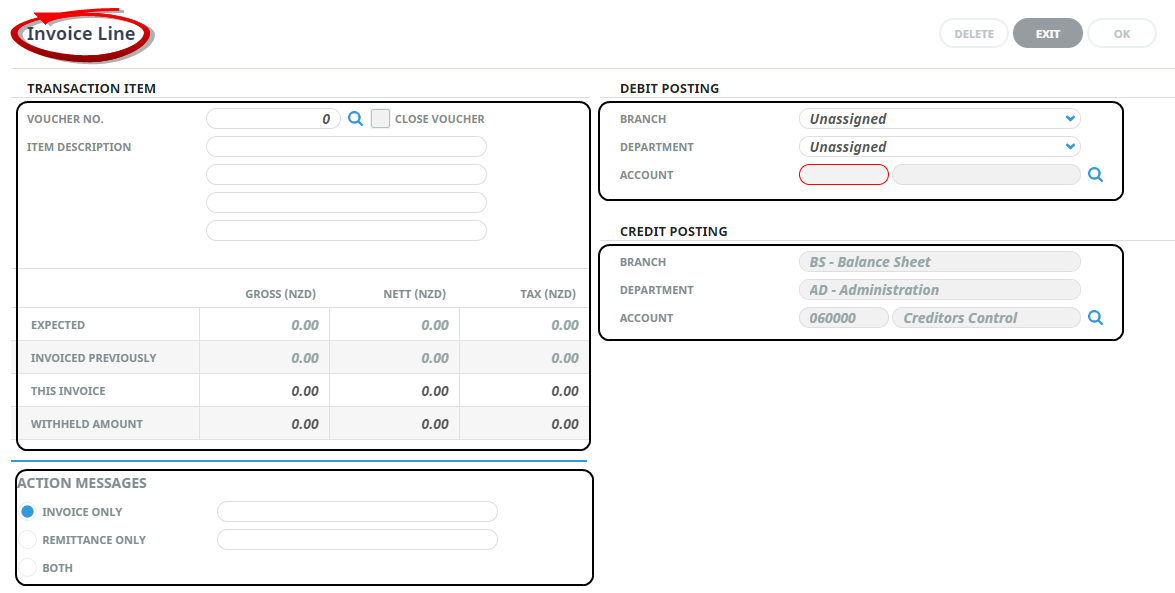 This section of the Invoice Line Detail Screen shows the General Ledger debit posting account. For a Creditors Invoice, the debit account will be the expense account associated with the transaction.