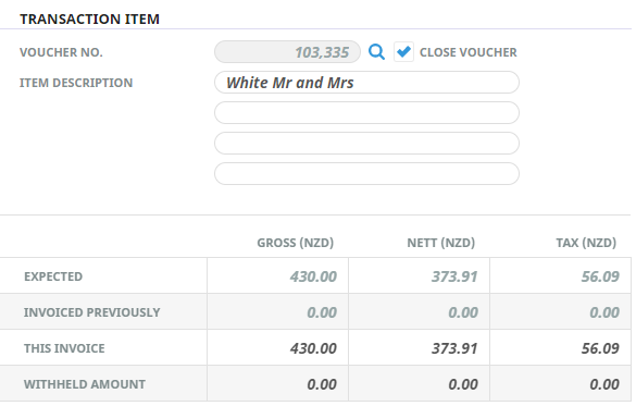 For bookings transactions, these fields will be automatically filled with the outstanding value of the service. If there have been no previous amounts invoiced for the service, the expected values are used. They can be overridden.
