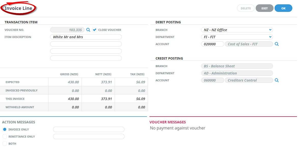 Example completed single Invoice Line screen. When the screen is populated, an additional Voucher Messages section displays.