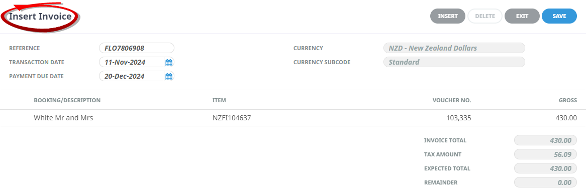 When a booking suppliers invoice is received covering one voucher, the following processing method is the simplest. This method does require that the voucher number is known. If the voucher number is unknown, see Insert Multiple Invoice Lines.