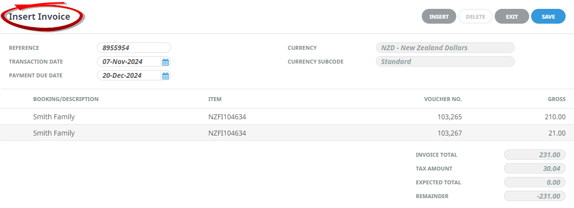 1. If the Invoice to which multiple invoice lines are to be added does not exist, create the Invoice first (see Insert Single Invoice Line).