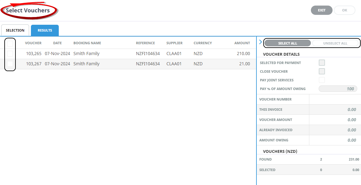 Selected - Displays the number of vouchers in the list that have been selected for processing and their total value.