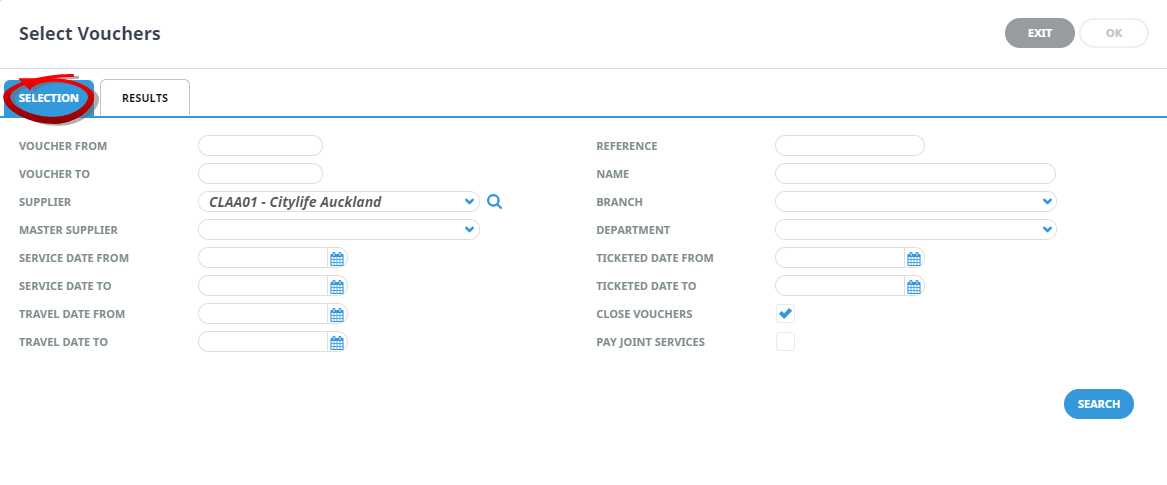 NOTE: If multiple vouchers are being searched for that are to be paid on one invoice, it is easier to leave these fields (except the Supplier) blank so that all qualifying services will display and can be matched against the suppliers invoice and selected.