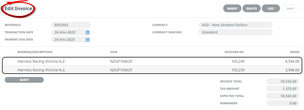 - The other is the Invoice Audit of the total invoice transaction which has high level detail of the invoice, such as posting accounts, periods and amounts. All lines in the invoice are displayed in the Audit screen. (See Audit a Creditors Invoice Transaction).