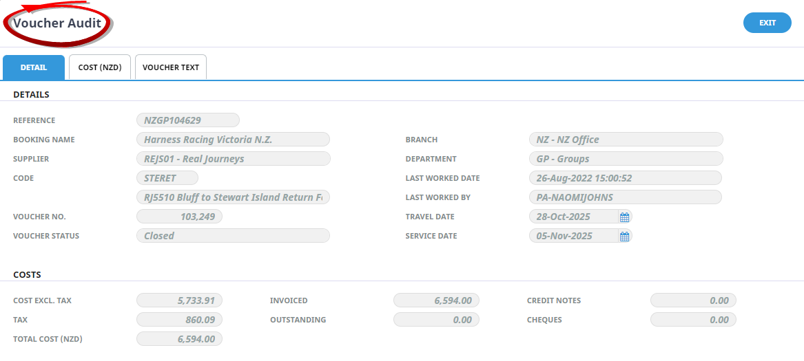 Greater detail is displayed in the cost detail tab for accommodation services than for non-accommodation services. There is a subtle difference in the way accommodation services for FITs and Groups are presented in this screen. For FITs services, there is a row for each Room in the booking that has used the service—e.g., if there were two double rooms using the service, then Double would show twice. In Groups, there is one row per room type.