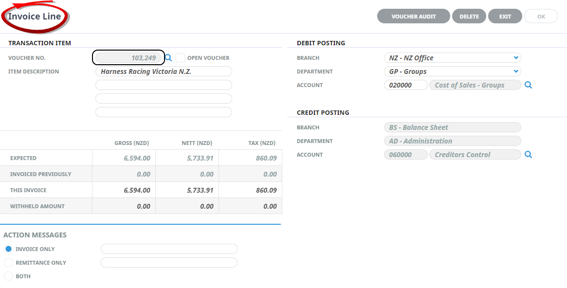 NOTE: The Audit button that displays below the Invoice Lines is the Invoice Audit (see Audit a Creditors Invoice Transaction), not the Voucher Audit.