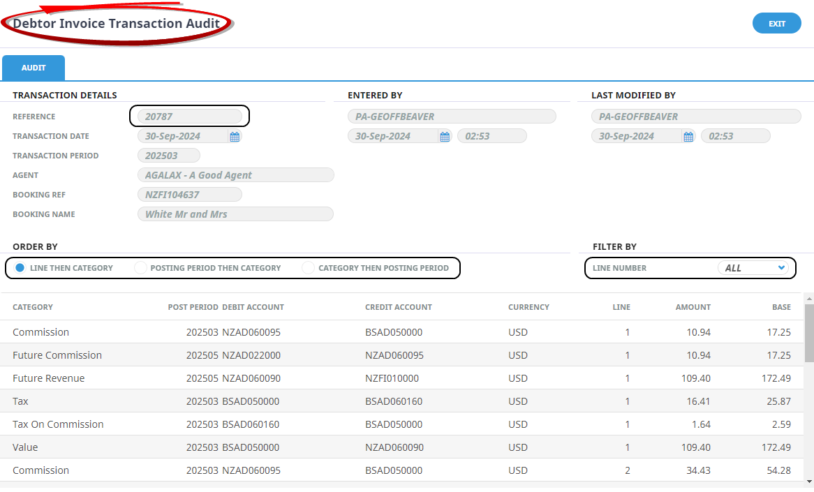 In the Transaction scroll, transaction lines can be clicked to open a Transaction Audit window.