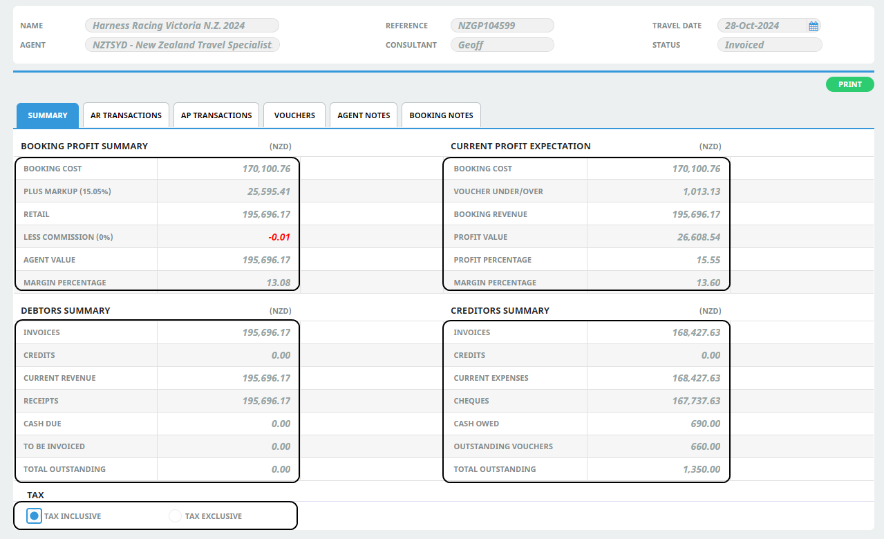 Use these radio buttons to display the booking either Inclusive or Exclusive of tax.